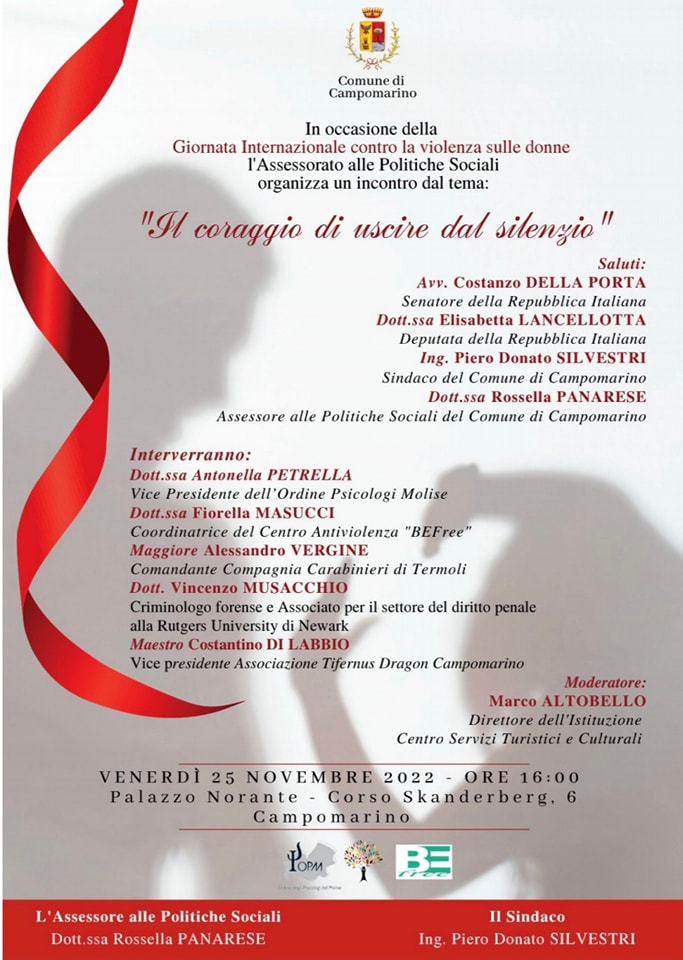 Il Comune di Campomarino partecipa alla Giornata internazionale per l’eliminazione della violenza sulle donne con una serie di iniziative tra cui un importante incontro – convegno dal titolo “Il coraggio di uscire dal silenzio”.