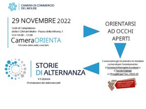 CAMPOBASSO – Il 29 novembre 2022, dalle 10 alle 12 si terrà presso la Sala Falcione, sede di Campobasso della Camera di Commercio del Molise, la premiazione delle scuole e dei centri di formazione molisani che hanno partecipato al concorso “Storie di Alternanza”.