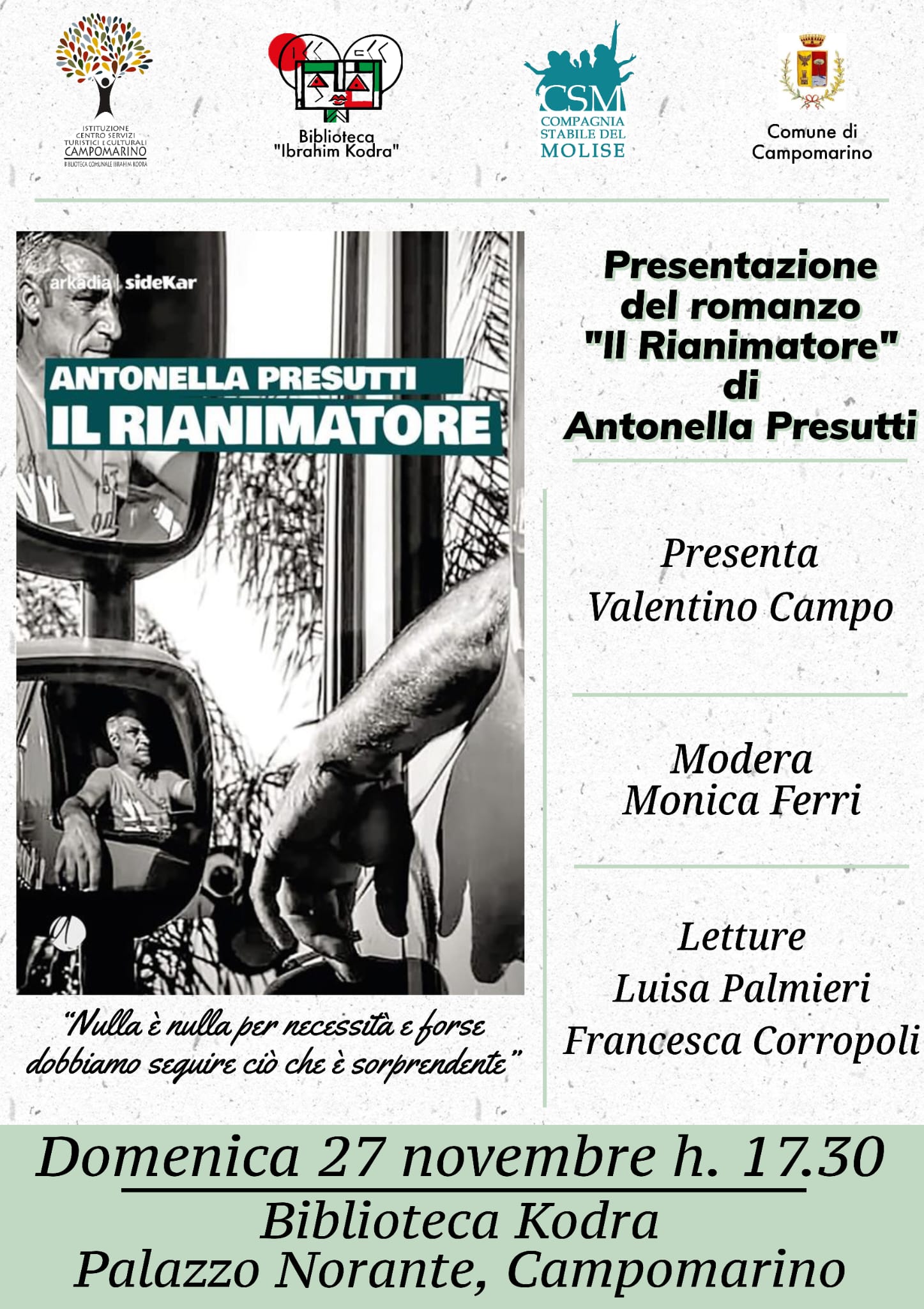 Domenica 27 novembre alle h. 17.30, nei locali della Biblioteca “Kodra” di Palazzo Norante, infatti, sarà presentato il libro ‘Il Rianimatore’ (Arkadia Editore) di Antonella Presutti, presidente della Fondazione Molise cultura.