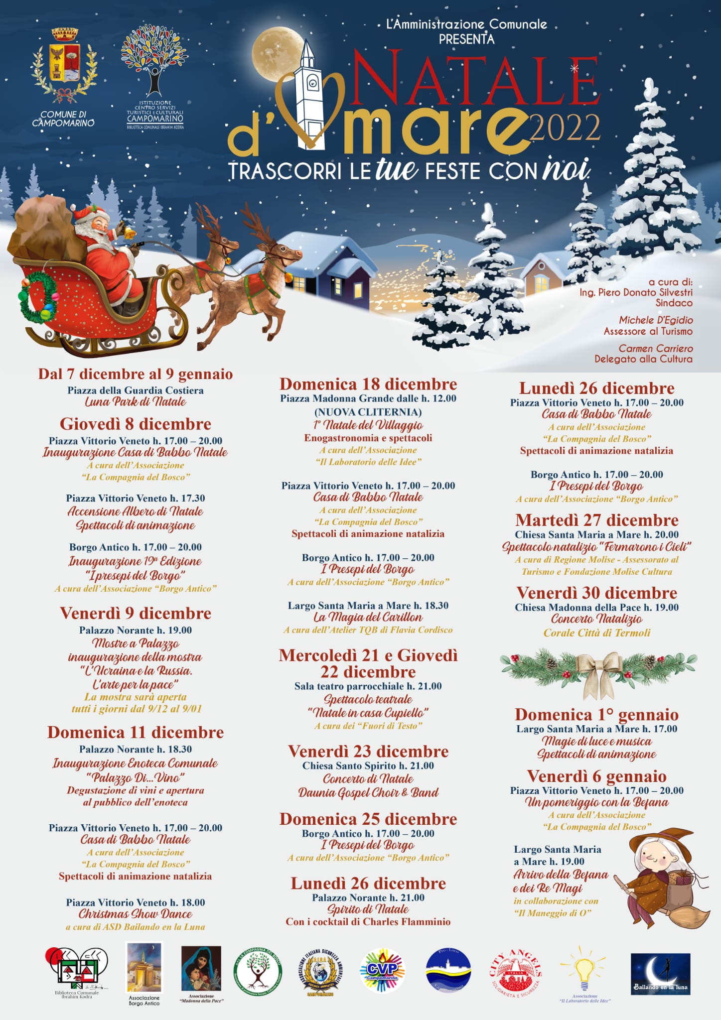 CAMPOMARINO – E’ stato pubblicato oggi il calendario degli eventi natalizi del Comune di Campomarino denominato “Natale d’AMare”.