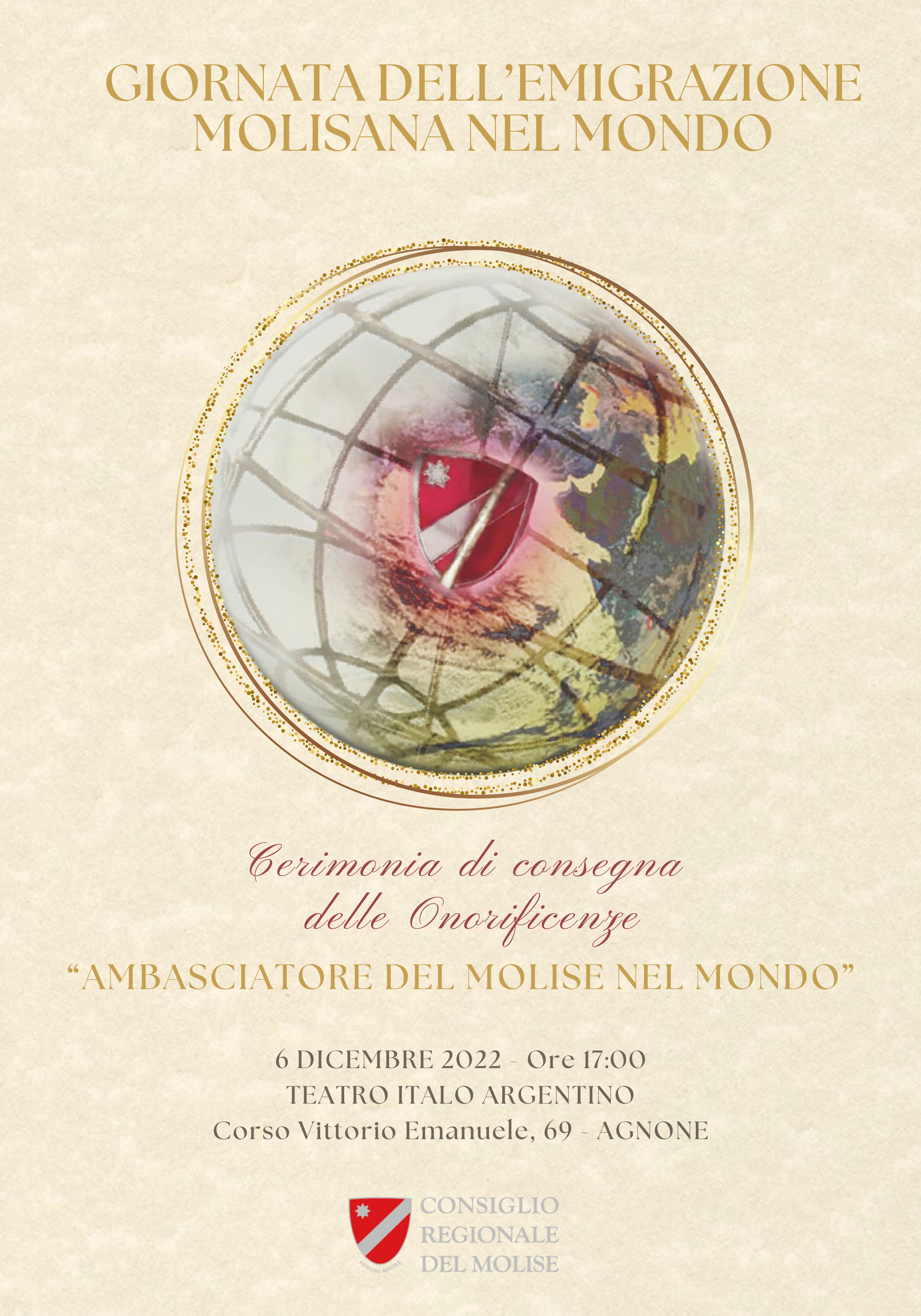 CAMPOBASSO – Le “Onorificenze di Ambasciatori del Molise nel mondo” verranno consegnate martedì 6 dicembre alle ore 17,00 presso il teatro Argentino di Agnone in occasione della “Giornata dell’emigrazione molisana nel Mondo”.