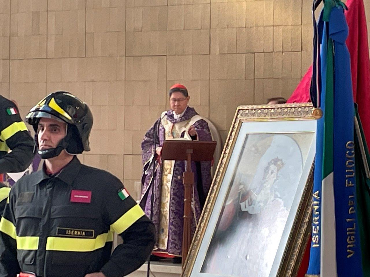 Come da tradizione si è svolta oggi 4 dicembre la ricorrenza di Santa Barbara, patrona del CNVVF, svolta in concomitanza del 25° anniversario di consacrazione della Chiesa di San Giuseppe Lavoratore di San Lazzaro, con una Solenne Celebrazione presieduta da Sua Eminenza Luis Antonio Gokim Cardinale Tagle, Prefetto del dicastero per l’Evangelizzazione dei popoli, con la partecipazione di numerose Autorità ecclesiastiche tra cui il Vescovo della Diocesi di Isernia-Venafro Don Camillo Cibotti.