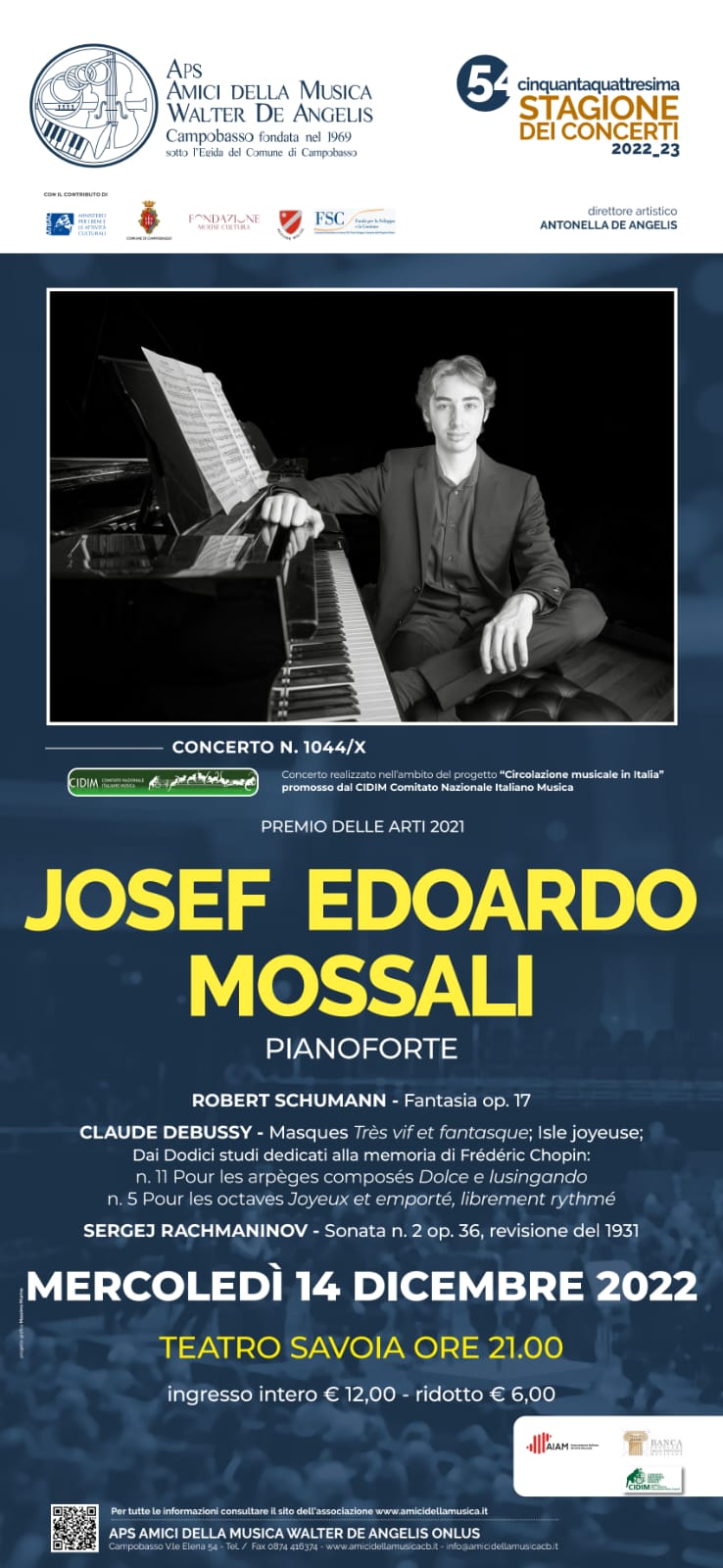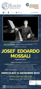 CAMPOBASSO – Domani, mercoledì 14 dicembre alle ore 21 al Teatro Savoia di Campobasso, prosegue la stagione concertistica degli Amici della Musica di Campobasso Walter De Angelis, con il recital del pianista Josef Edoardo Mossali, vincitore nel 2012 del Premio Nazionale delle Arti. Il pianista eseguirà brani di Schumann, Rachmaninov e Debussy.