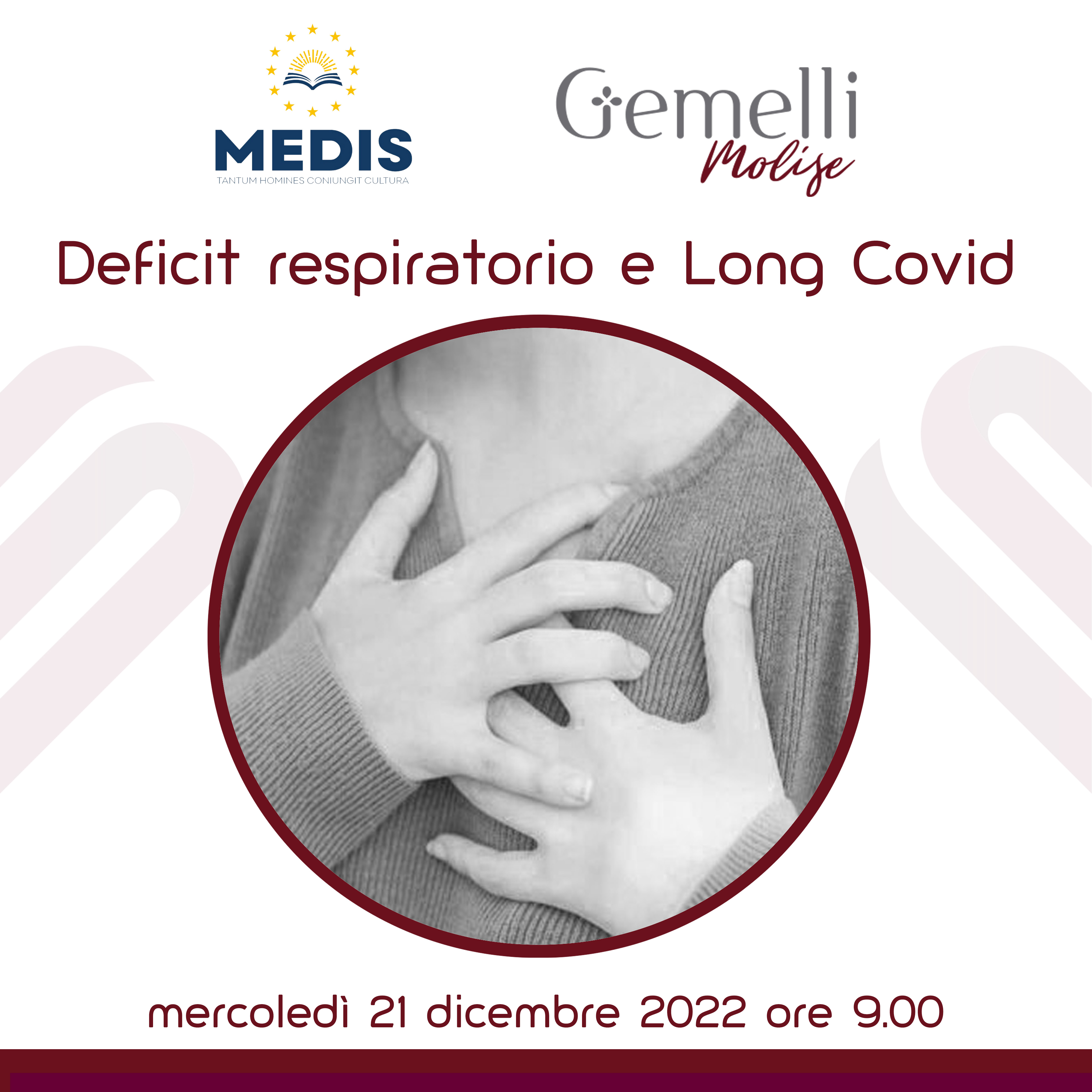 Alcuni dei maggiori esperi del settore si confronteranno sull’argomento nell’ambito dell’evento formativo: “Deficit respiratorio e Long Covid” promosso dal Gemelli Molise e da Medis – Scuola Internazionale di Maxiemergenze – il prossimo 21 dicembre alle ore 9.00. Coordineranno le sessioni scientifiche, Maurizio Panunzio, Consigliere di Amministrazione e Specialista in Medicina Fisica e Riabilitativa, e Enrico Bernini Carri, Presidente di Medis – Scuola Internazionale di Maxiemergenze e Medico infettivologo.