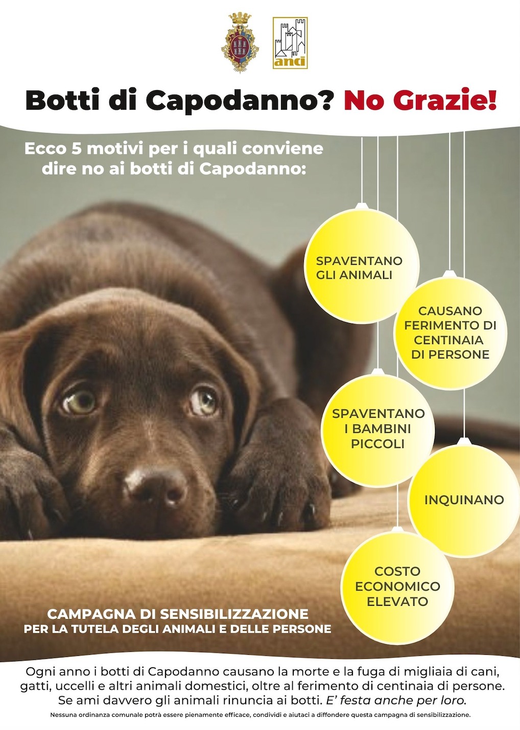 Una norma introdotta per la tutela dei nostri amici a quattro zampe, sia domestici che randagi, spesso spaventati a morte dalle esplosioni dei petardi. “Il Comune di Campobasso aderisce alla campagna di sensibilizzazione per la tutela delle persone e degli animali in occasione delle festività di fine anno. – ha dichiarato espressamente il sindaco di Campobasso, Roberto Gravina – Oltre al ferimento di centinaia di persone, ogni anno, i cosiddetti botti di capodanno, causano la morte e la fuga di migliaia di cani, gatti, uccelli e altri animali domestici. Chi ama davvero gli animali rinuncia ai botti. È festa anche per loro.”