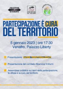 VENAFRO – “Partecipazione è cura del territorio” è il titolo dell’incontro pubblico che si terrà domani, giovedì 5 gennaio 2023, alle ore 17:30, presso la sala convegni della Palazzina Liberty di Venafro.