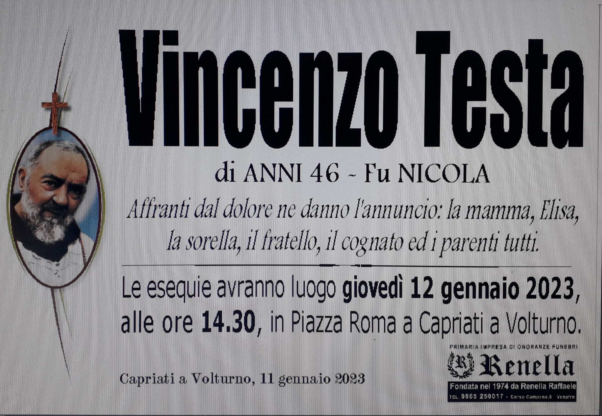 Si terranno domani i funerali di Vincenzo Testa, il Carabiniere 46enne che ha perso la vita lo scorso quattro gennaio, in uno scontro avvenuto sulla strada statale 6 Casilina, mentre il militare stava rientrando a Roma dove prestava servizio.