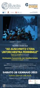 Lo spettacolo “𝐀𝐝 𝐀𝐮𝐬𝐜𝐡𝐰𝐢𝐭𝐳 𝐜’𝐞𝐫𝐚 𝐮𝐧’𝐨𝐫𝐜𝐡𝐞𝐬𝐭𝐫𝐚 𝐟𝐞𝐦𝐦𝐢𝐧𝐢𝐥𝐞” , tratto da una storia vera, con l’Orchestra Femminile del Mediterraneo, diretta dal Mastro Antonella De Angelis e le attrici Tiziana Di Tonno, nel ruolo di Fania Fenèlon e Susanna Costaglione, nel ruolo di Alma Rosé, è già presente nella programmazione della Stagione concertistica degli Amici Della Musica, e sarà riproposto al pubblico cittadino nel pomeriggio di sabato 28 gennaio, alle ore 18:30, presso il Teatro Savoia. I biglietti si possono acquistare con pagamento in contanti o carta di credito il martedì, mercoledì o giovedì dalle ore 16.30 alle 19.00 presso la sede dell’Associazione in Via.le Elena n.54 Campobasso o il giorno stesso al Teatro Savoia. Per info: http://www.amicidellamusicacb.it/