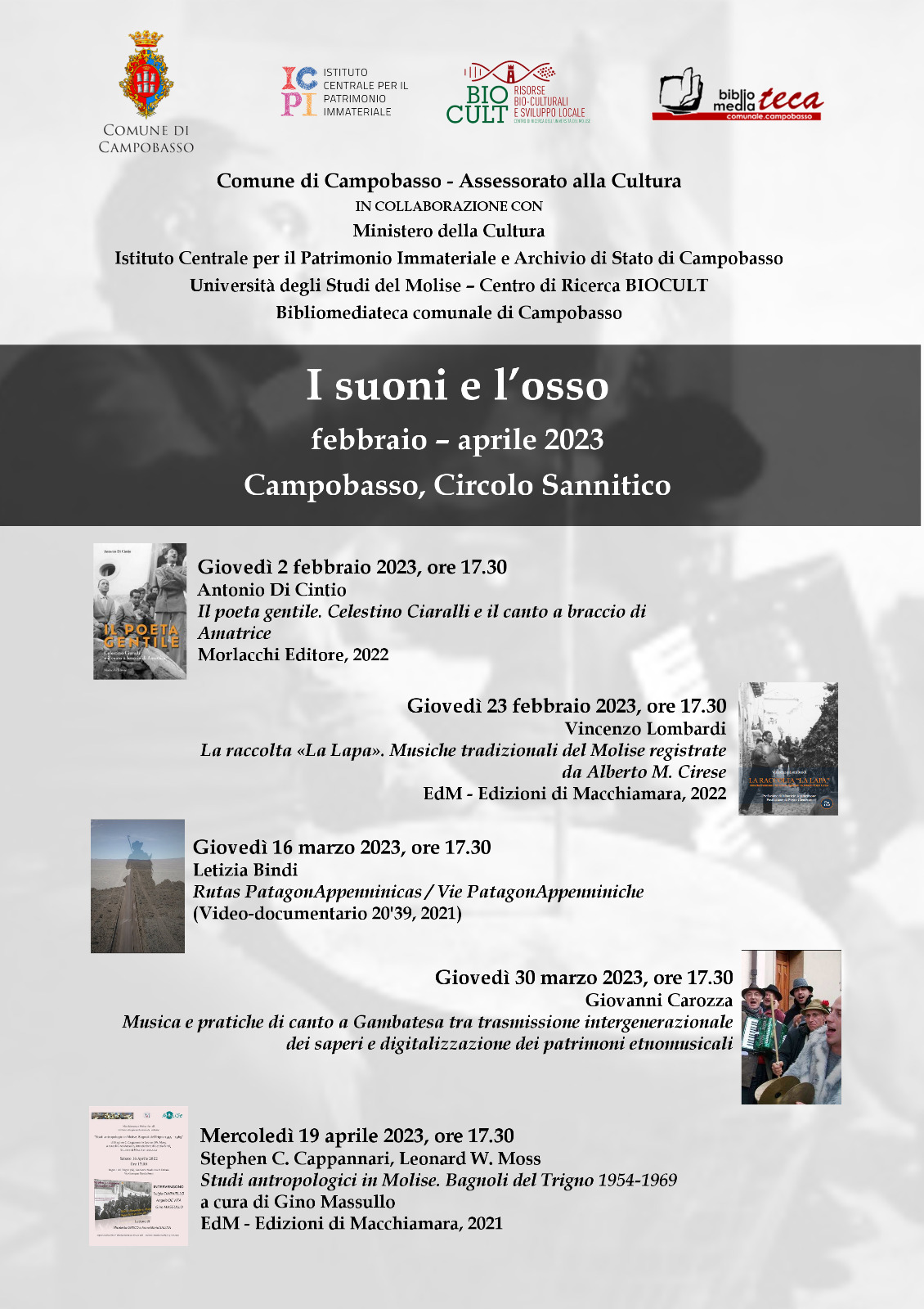 Il Comune di Campobasso, attraverso l’assessorato alla Cultura, in collaborazione con il Ministero della Cultura, Istituto Centrale per il Patrimonio Immateriale e l’Archivio di Stato di Campobasso, l’Università degli Studi del Molise – Centro di Ricerca BIOCULT e la Bibliomediateca Comunale di Campobasso, a partire dal prossimo 2 febbraio e fino al 19 di aprile, propone un ciclo di ben cinque incontri dal forte interesse etnoantropologico ed etnomusicale.