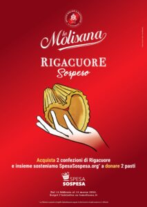 Dal 14 febbraio al 14 marzo torna “Rigacuore Sospeso”, l’attività benefica della Molisana in collaborazione con SpesaSospesa.org. Sulla stima delle vendite, ogni due pacchetti di Rigacuore acquistati il pastificio devolverà, attraverso il progetto di solidarietà, due pasti ai più bisognosi. L’attività sociale coinvolgerà tutti i punti vendita in Italia che trattano il Rigacuore, il formato a forma di cuore, che sensibilizza ancor più il messaggio di solidarietà che prende il via il giorno di San Valentino.