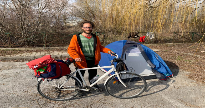 “Simone ha 34 anni – scrive in un Facebook il consigliere comunale di Volt Umberto di Giacomo – , una bici e quella tenda che ha accanto sarà la sua casa a Isernia fino a domenica. È partito venerdì scorso dalla provincia di Rimini e dopo circa 500 km è arrivato qui da noi per il Carnevale Europeo Maschere Zoomorfe.