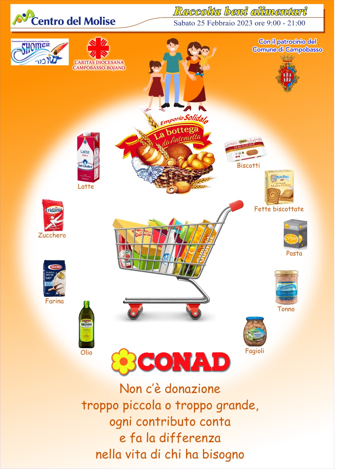 CAMPOBASSO – Sabato 25 febbraio raccolta beni alimentari presso il Conad Centro del Molise a favore dell’Emporio Solidale “La Bottega di Antonietta”.