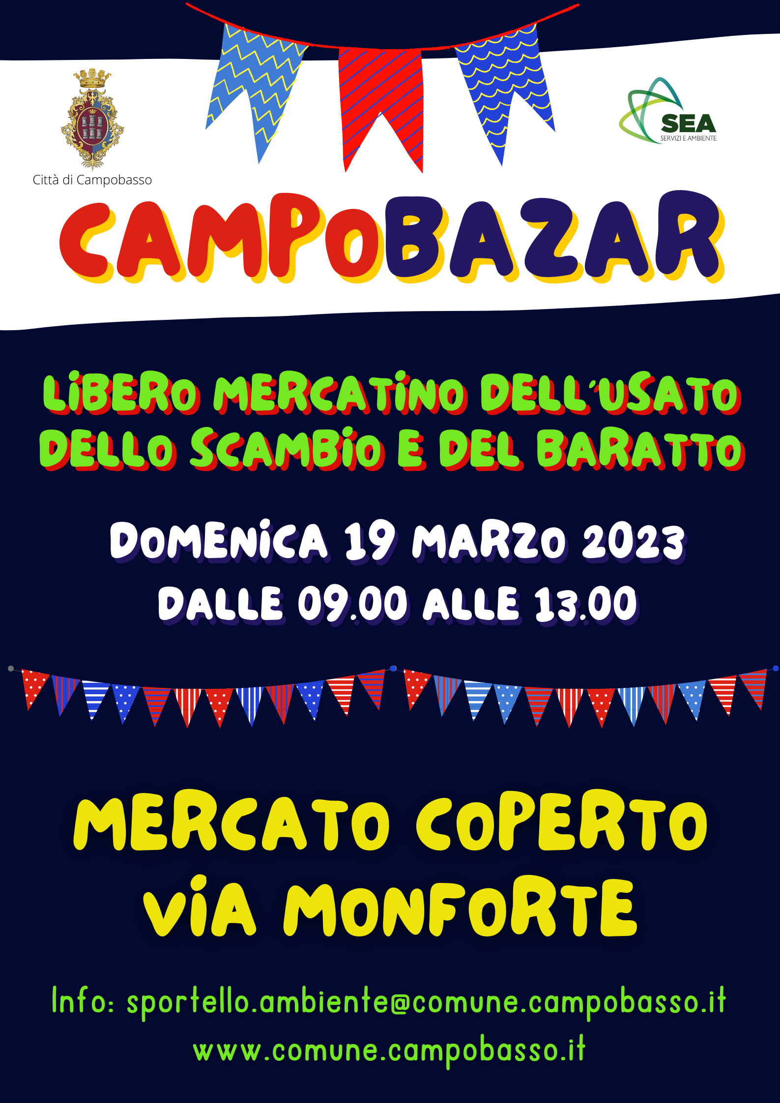 Per partecipare al Campobazar, come di consueto, è necessario inviare l’apposito modulo compilato (disponibile sul sito del Comune nella sezione ‘aree tematiche – ambiente e rifiuti’) all’indirizzo e-mail sportello.ambiente@comune.campobasso entro e non oltre il prossimo 17 marzo.