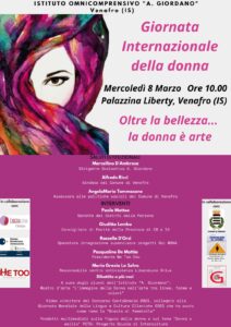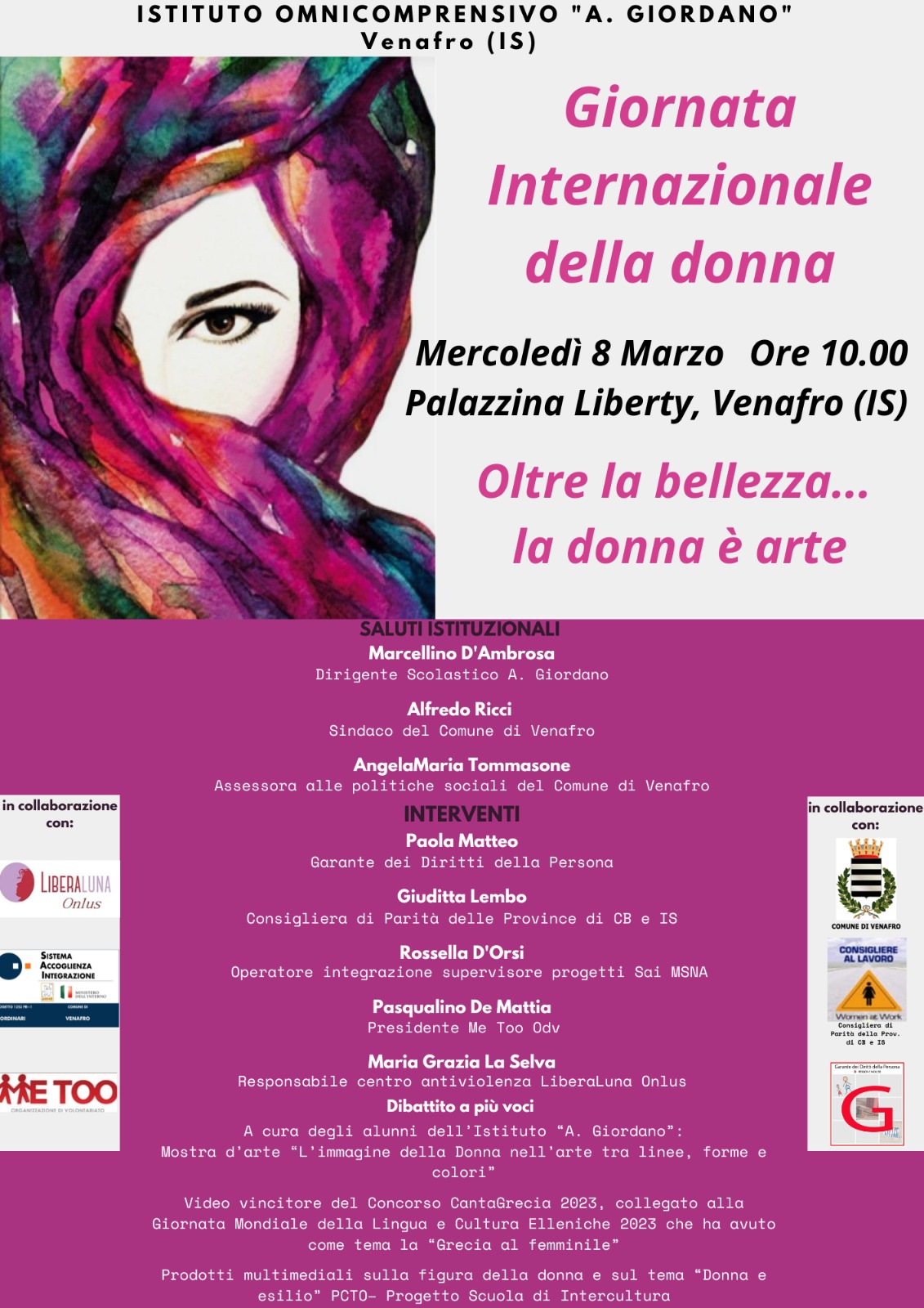 L’appuntamento è per mercoledì 8 marzo alla Palazzina Liberty a partire dalle ore 10. “Oltre la bellezza…la donna è arte”: un titolo che racchiude tante esperienze sul campo che saranno raccontate dagli studenti venafrani. «In occasione della Giornata internazionale della donna- ricordano gli organizzatori-, l’Istituto “A. Giordano” organizza, come ogni anno, iniziative per promuovere sempre più la figura e il ruolo della donna, per ripercorrere le conquiste e i diritti ottenuti, ma anche per ricordare le discriminazioni e le violenze di cui le donne sono state, e sono ancora, oggetto. In quest’ottica mercoledì 8 marzo alle ore 10.00, presso la Palazzina Liberty, si terrà l’evento dal titolo “Oltre la bellezza… la donna è arte”. Interverranno: il Dirigente scolastico, Marcellino D’Ambrosa; Sindaco del comune di Venafro, Alfredo Ricci; l’Assessora alle politiche sociali del Comune di Venafro, Angelamaria Tommasone; la Garante dei Diritti della Persona, Paola Matteo; la Consigliera di Parità delle Province di Campobasso e Isernia, Giuditta Lembo; le associazioni del territorio: Me Too Odv, Liberaluna Onlus e il SAI (Sistema accoglienza Integrazione) di Venafro.  Perché detta celebrazione si connoti quale alto momento civico di analisi e riflessione verranno presentati i lavori degli alunni dell’Istituto “A. Giordano” in una mostra d’arte intitolata “L’immagine della Donna nell’arte tra linee, forme e colori”. Inoltre verranno presentati prodotti multimediali a tema e il video vincitore del Concorso CantaGrecia 2023, collegato alla Giornata Mondiale della Lingua e Cultura Elleniche 2023 che ha avuto come tema la “Grecia al femminile”.  L’incontro verrà arricchito da un dibattito a più voci con le Istituzioni presenti.»