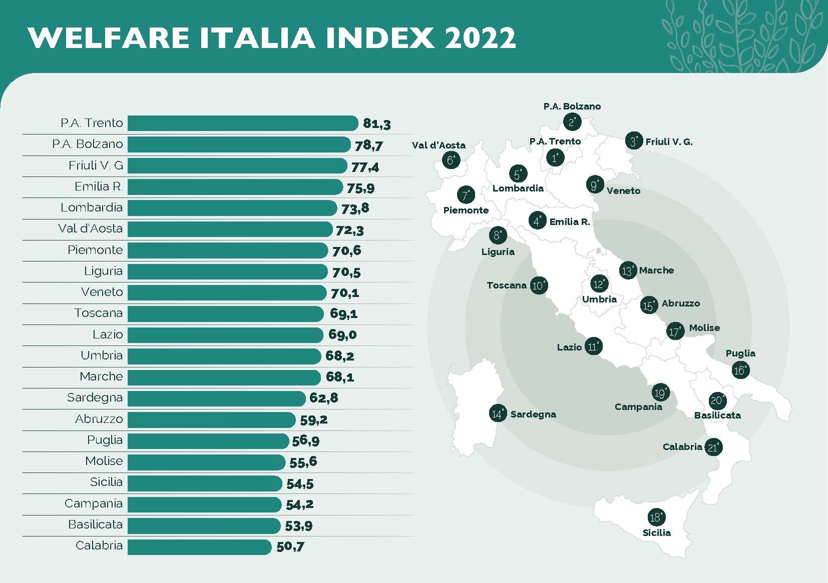 Il dato emerge dalle classifiche del “Welfare Italia Index 2022” – strumento di monitoraggio che prende in considerazione gli ambiti di politiche sociali, sanità, previdenza e formazione e consente di identificare, a livello regionale, i punti di forza e le aree di criticità in cui è necessario intervenire – realizzato da “Welfare, Italia”, Think Tank nato su iniziativa di Unipol Gruppo in collaborazione con The European House – Ambrosetti.