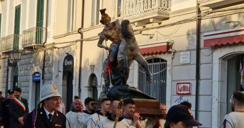 E allora, se oggi abbiamo potuto incontrare di nuovo per strada il nostro patrono dobbiamo usare la parola grazie per i portatori della statua di San Giorgio, che quest’anno sono i portatori abituali del mistero di San Leonardo, per il loro caposquadra e per l’Associazione Misteri e Tradizioni con il suo presidente architetto Liberato Teberino.