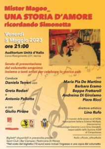 ISERNIA – Venerdì 5 Maggio, presso l’Auditorium “Unità d’Italia” di Isernia, andrà in scena l’evento “Mister Magoo: una storia d’amore” per ricordare Simonetta, moglie di Giulio Pirone, proprietario dello storico pub, attraverso diverse testimonianze e la presenza di numerosi artisti.