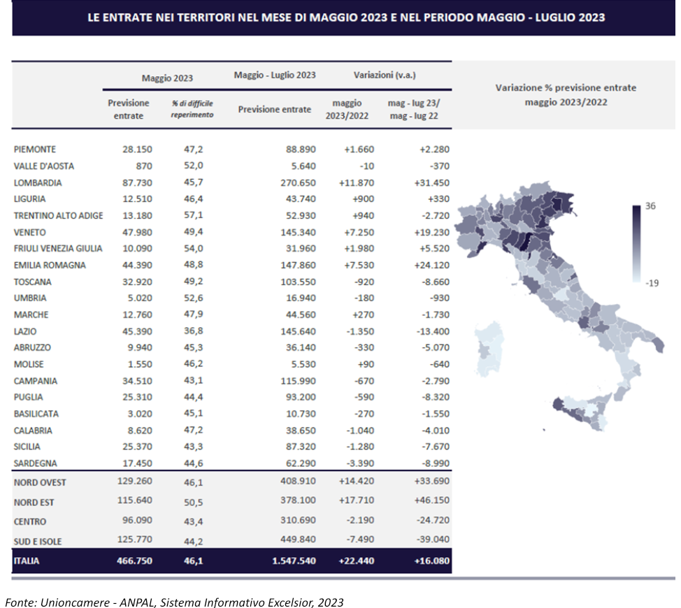 A livello territoriale si evidenzia, infine, come il flusso delle entrate previste a maggio nelle regioni del Nord risulti in crescita rispetto allo stesso mese del 2022 (+14mila unità per il Nord Ovest e + 18mila per il Nord est), a fronte di una tendenza negativa per il Centro (-2mila) e per il Sud e Isole (-7mila entrate).