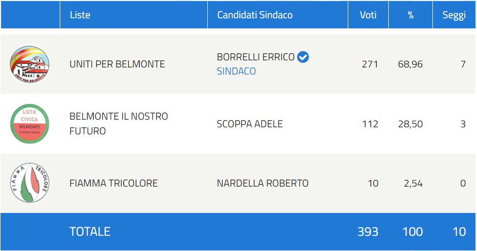 Vince la lista civica “Uniti per Belmonte” che conquista il 68,96% delle preferenze con 271 voti, mentre Adele Scoppa, della lista civica “Belmonte il nostro futuro”, si ferma al 28,50%, conquistando 112 voti. Infine solo 10 voti per la lista “Fiamma Tricolore” di Roberto Nardella.