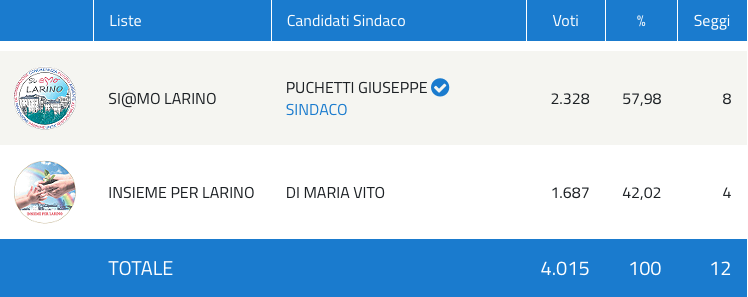 Vince la lista civica “Si@mo Larino” che conquista il 57,98% delle preferenze con 2.328 voti, mentre Vito Di Maria, della lista civica “Insieme per Larino“, si ferma al 42,02%, conquistando 1.687 voti.