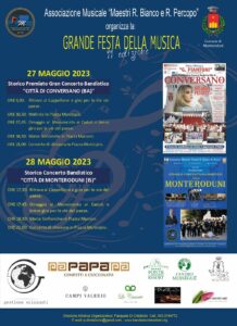 Quest’anno aprirà la festa lo Storico Premiato Gran Concerto “Città di Conversano (BA)” – G. Piantoni, sotto la direzione di Susanna Pescetti (Direttore d’Orchestra) che allieterà la giornata dalle ore 9 del mattino alla mezzanotte. La Banda di Conversano, sabato 27 maggio 2023 si esibirà al pubblico durante il matinée musicale con La Cavalleria Rusticana di P. Mascagni e la Marcia Slava di P. Čajkovskij; mentre al concerto serale con la 1812 di P. Čajkovskij, La Traviata di G. Verdi, il Barbiere di Siviglia di G. Rossini e un gran finale con il Bolero di M. Ravel.