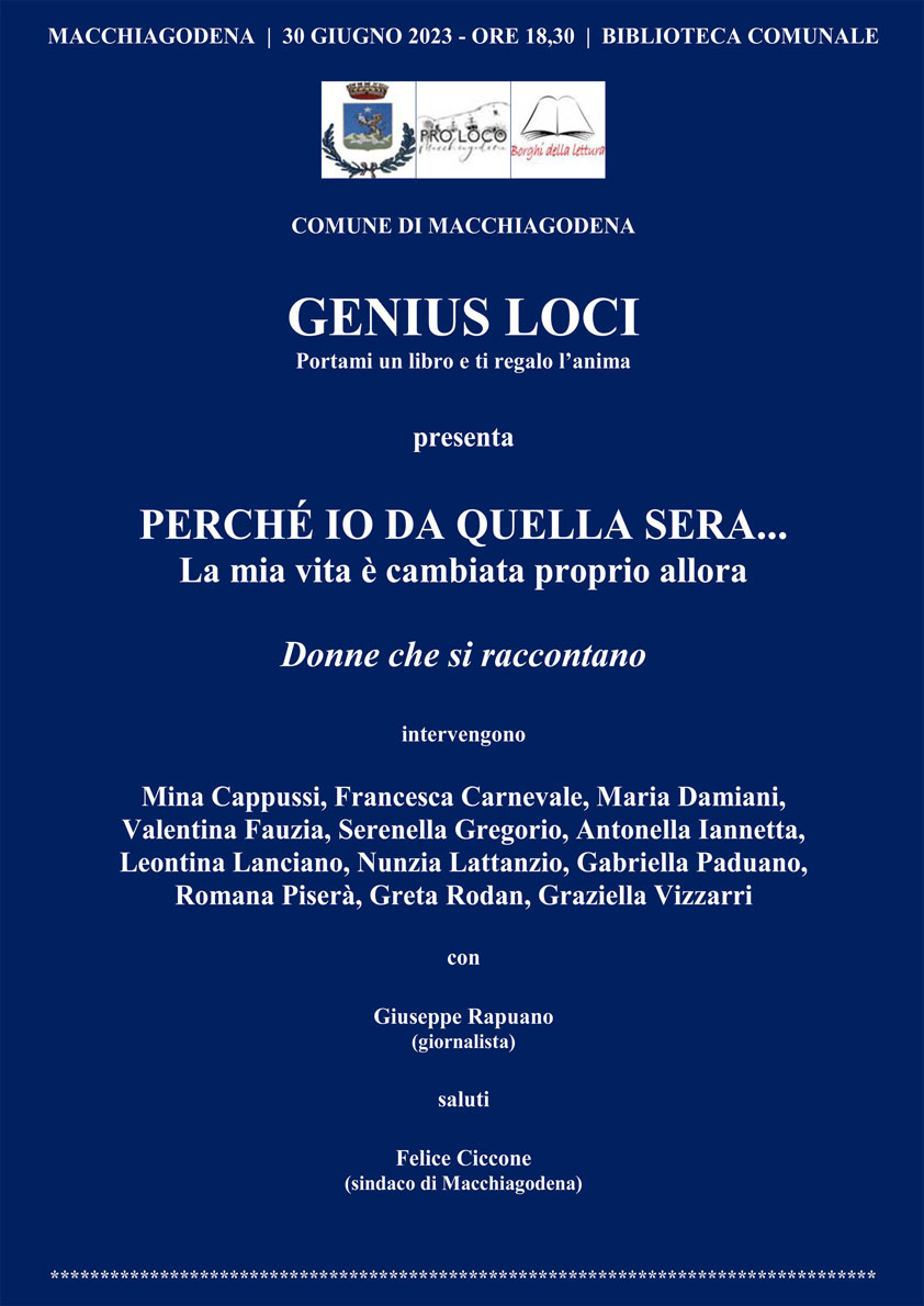 MACCHIAGODENA – Venerdì 30 giugno, a partire dalle ore 18:30 presso la biblioteca comunale di Macchiagodena, avrà luogo il nuovo appuntamento del progetto culturale “Genius Loci. Portami un libro e ti regalo l’anima”.