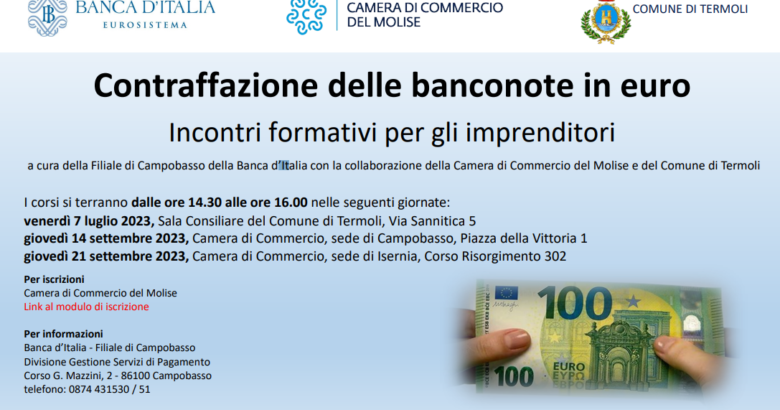 CAMPOBASSO – La Filiale della Banca d’Italia di Campobasso, in collaborazione con la Camera di Commercio del Molise e con il Comune di Termoli, ha organizzato un ciclo di tre incontri rivolti agli imprenditori sul fenomeno della contraffazione delle banconote.