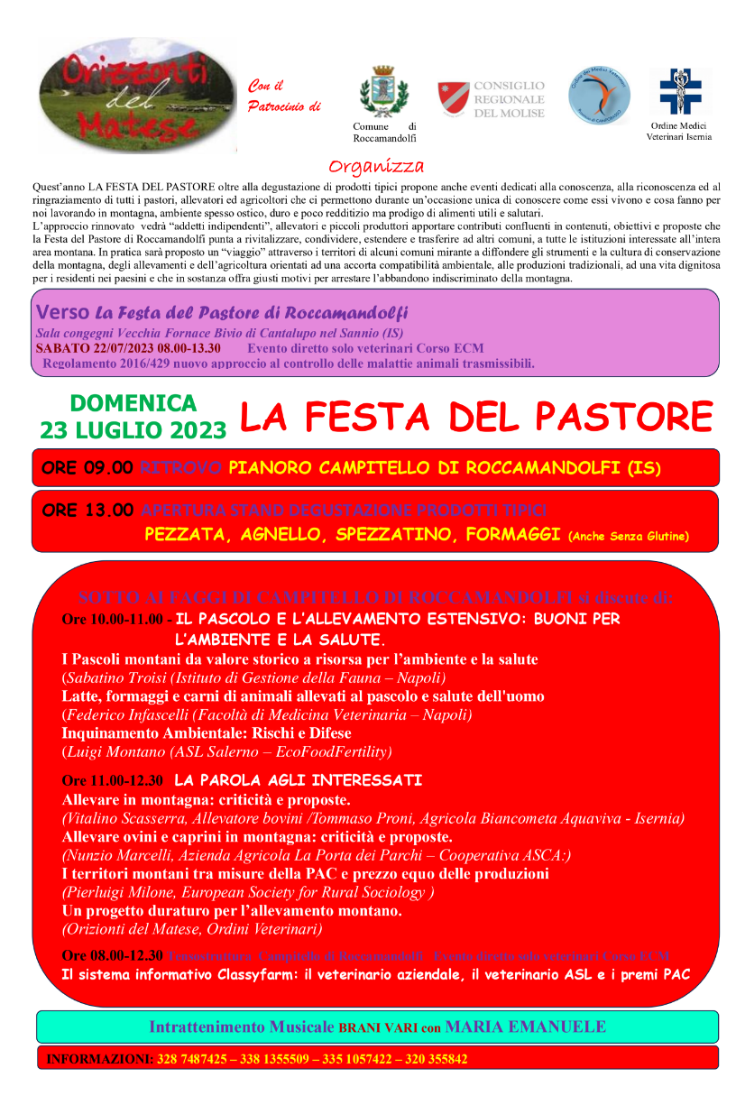 Un appuntamento che accende gli animi del piccolo e pittoresco borgo di Roccamandolfi attirando sulla sua stupenda montagna migliaia di visitatori. Ad organizzare, come sempre, l’evento è l’Associazione Orizzonti del Matese, con il Patrocinio del Consiglio Regionale del Molise, del Comune di Roccamandolfi e dell’ordine dei Medici Veterinari del Molise, quest’anno proprio in collaborazione con i medici veterinari, si è messo in campo una iniziativa molto impegnativa ma allo stesso tempo di rilievo, la presenza di esperti veterinari e del mondo universitario, spigheranno ai partecipanti al convegno, l’ importanza dell’alimentazione animale e le ripercussioni sull’essere umano.