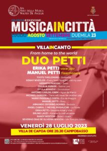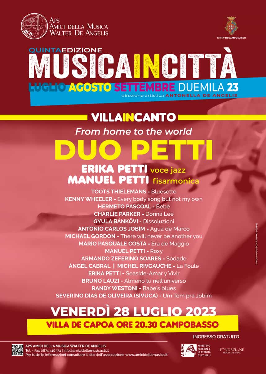 CAMPOBASSO – Da domani, venerdì 28 luglio alle 20.30 a Villa de Capoa, prenderà il via la rassegna VillainCanto con il concerto “From home to the world” del Duo Petti, composto dai musicisti molisani Erika e Manuel Petti, voce jazz e fisarmonica.