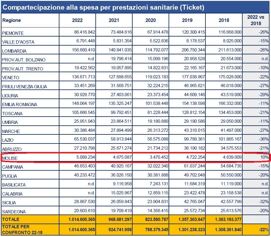 CAMPOBASSO – Analisi dell’andamento dei ricavi da ticket anni 2018-2022. L’Agenas ha realizzato un approfondimento sull’andamento della compartecipazione alla spesa per prestazioni sanitarie (ticket) da parte dei cittadini nel periodo tra il 2018 e il 2022.
