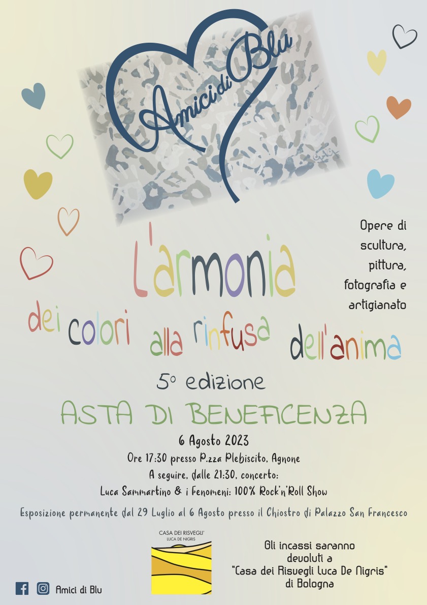 AGNONE – Avrà inizio alle 17.30 di domenica 6 agosto 2023 la quinta edizione dell’asta “L’Armonia dei colori alla rinfusa dell’anima” organizzata dagli Amici di Blu.