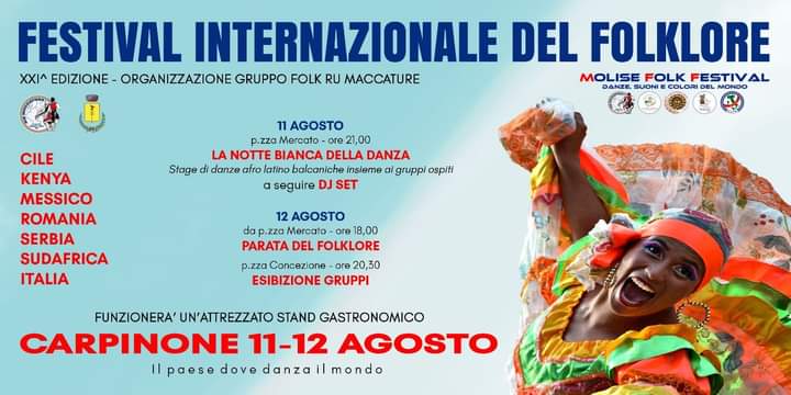 Il giorno successivo, il 12 agosto, Carpinone sarà invaso da colori e suoni di tutto il mondo per il FESTIVAL INTERNAZIONALE DEL FOLKLORE 2023 con ben 7 nazioni rappresentate che si esibiranno con danze, canti, costumi e strumenti tradizionali delle loro terre d’origine. L’Italia sarà rappresentata dal Gruppo Folk Ciociaro “Valle di Comino” di Atina e dai padroni di casa de  “Ru Maccature” con l’organizzazione di Molise Folk.