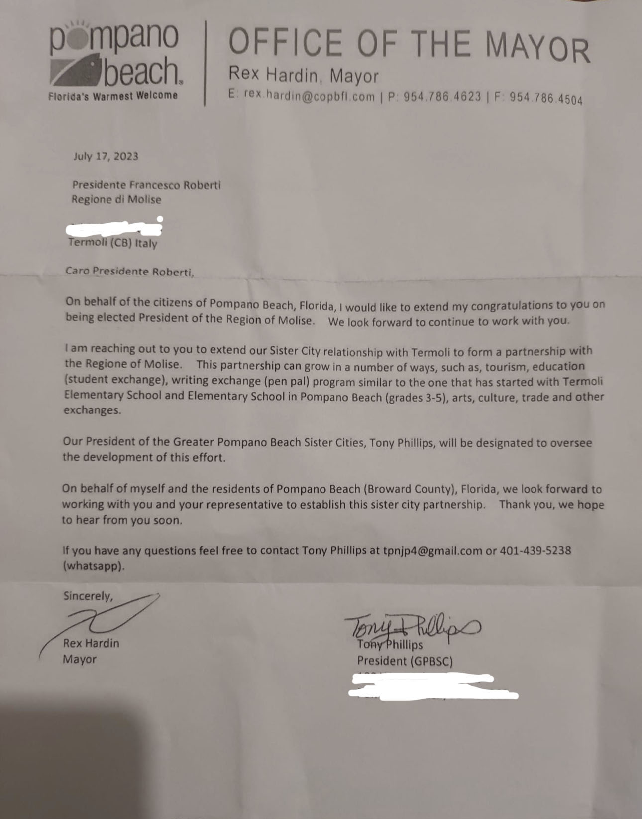 Nella missiva oltre agli auguri per il nuovo incarico di Roberti, il “Major” della città di Pompano si augura che la collaborazione intrapresa con la città di Termoli possa interessare anche la regione Molise e la regione di Pompano Beach nei settori scolastici e turistici così come già avvenuto con alcune scuole di Termoli.