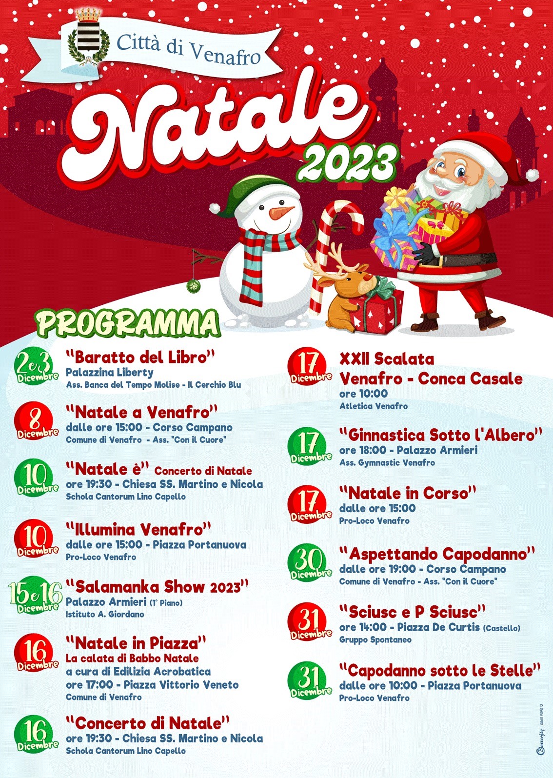 Tanti gli appuntamenti in programma: i concerti nella chiesa dei Santi Martino e Nicola a cura della Schola Cantorum Lino Capello, le iniziative “Illumina Venafro“, “Natale in corso” e “Capodanno sotto le Stelle” a cura della Pro Loco, il Salamanka Show dell’Istituto Giordano, per gli sportivi “Ginnastica sotto l’albero” e la tradizionale Scalata Venafro-Conca Casale, giunta alla ventiduesima edizione, manifestazioni organizzate rispettivamente dalla Gymnastic Venafro e dall’Atletica Venafro; per concludere il 30 dicembre con “Aspettando Capodanno” a cura dell’Associazione “Con il Cuore” e il 31 con “Sciusc e P Sciusc” del gruppo spontaneo di piazza De Curtis.
