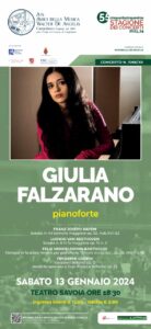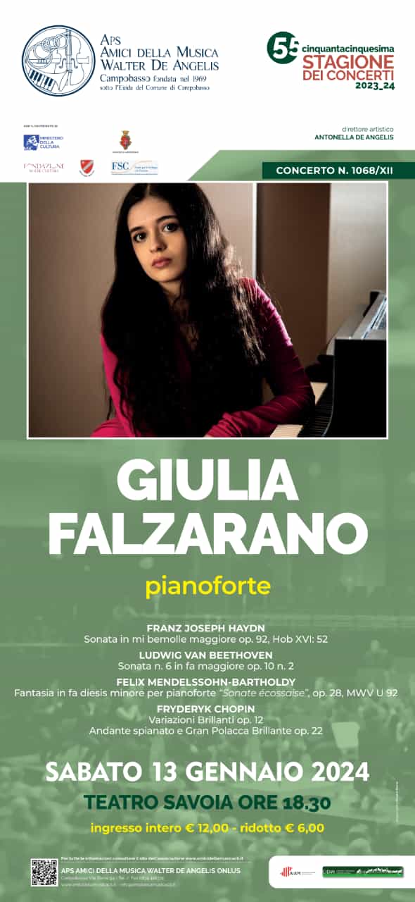 CAMPOBASSO – Sabato 13 gennaio alle 18,30, nel primo appuntamento del 2024 della stagione concertistica, organizzata dall’Associazione Amici della Musica “Walter De Angelis” di Campobasso, salirà sul palco del Teatro Savoia la pianista Giulia Falzarano, con un programma che spazia da Franz Joseph Haydn (Sonata in mi bemolle maggiore op. 92, Hob XVI: 52) a Ludwig Van Beethoven (Sonata n. 6 in fa maggiore op. 10 n. 2), da Felix Mendelssohn-Bartholdy (Fantasia in fa diesis minore per pianoforte “Sonate écossaise”, op. 28, MWV U 92) fino a Fryderyk Chopin (Variazioni Brillanti op. 12; Andante spianato e Grande Polacca Brillante op. 22).