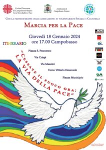CAMPOBASSO – La Curia Arcivescovile di Campobasso – Bojano, la Caritas Diocesana, insieme ad associazioni del volontariato sociale e culturale, ed associazioni sindacali, organizzano, nel capoluogo, una “Marcia per la Pace” per il giorno 18 di gennaio p.v..