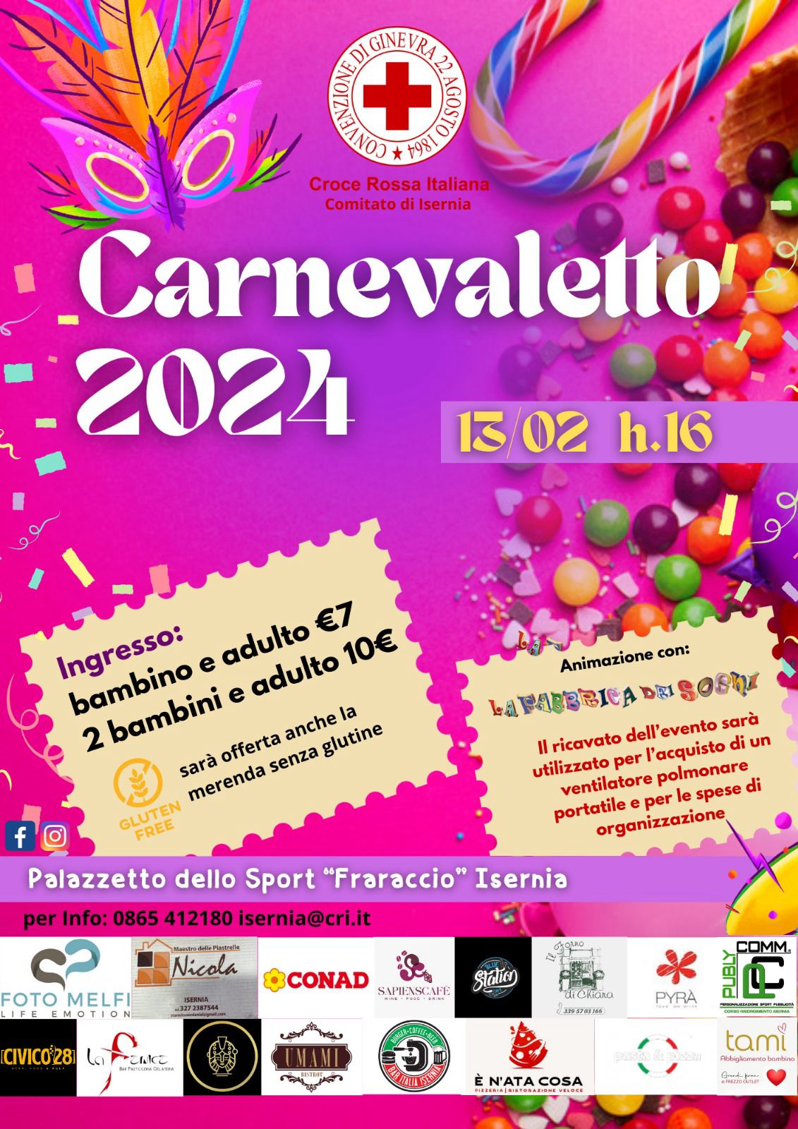 ISERNIA – Anche quest’anno torna l’appuntamento con il Carnevaletto della Croce Rossa, una manifestazione all’insegna del divertimento e della solidarietà dedicato ai più piccoli che si terrà il giorno 13 febbraio alle ore 16 presso il Palazzetto dello Sport “Fraraccio” di Isernia.