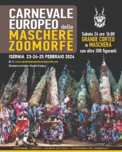 Parteciperanno: i Meckari di Prilep (Macedonia del Nord); i Survakari di Sadovik (Bulgaria); i Kurenti di Ptuj (Slovenia); gli Dzolomari di Begnishte (Macedonia del Nord); i Boes e i Merdules di Ottana (Sardegna); il Diavolo di Tufara (Molise); lu Pulgenella di Castiglione Messer Marino (Abruzzo); il Brutto, il Bello e Santa Monna di Macchiagodena (Molise); l’Uomo-Orso di Jelsi (Molise); su Boi e su Omadori di Escalaplano (Sardegna); l’Uomo-Cervo di Castelnuovo al Volturno (Molise); l’Orso e la Corte principesca di Saponara (Sicilia). Lungo il percorso a disposizione street food. - ore 20.30: Festa Finale in piazza Andrea d’Isernia.