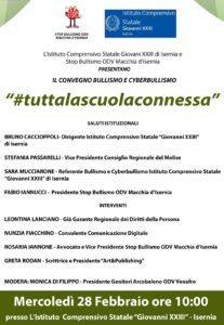 ISERNIA – L’istituto Comprensivo Statale Giovanni XXIII e l’associazione StopBullismo ODV Macchia d’Isernia, presentano il convegno #TuttaLaScuolaConnessa”, che si terrà domani, mercoledì 28 febbraio alle ore 10:00 e che affronta la purtroppo attualissima tematica del Bullismo e del Cyberbullismo.