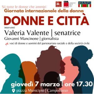 In occasione della Giornata Internazionale delle Donne, il prossimo 7 marzo, alle ore 17.30 nel gazebo del Bar Centrale in Piazza Municipio a Campobasso, Ali Molise, Cgil Molise e Anpi Molise organizzano un dibattito pubblico aperto sulla condizione femminile, al quale parteciperanno, tra gli altri, il giornalista Giovanni Mancinone e la Senatrice del Partito Democratico Valeria Valente, componente della prima Commissione Affari Costituzionali, della Commissione parlamentare antimafia, della Commissione parlamentare di inchiesta sul femminicidio, nonché su ogni forma di violenza di genere e del Consiglio di garanzia del Senato.