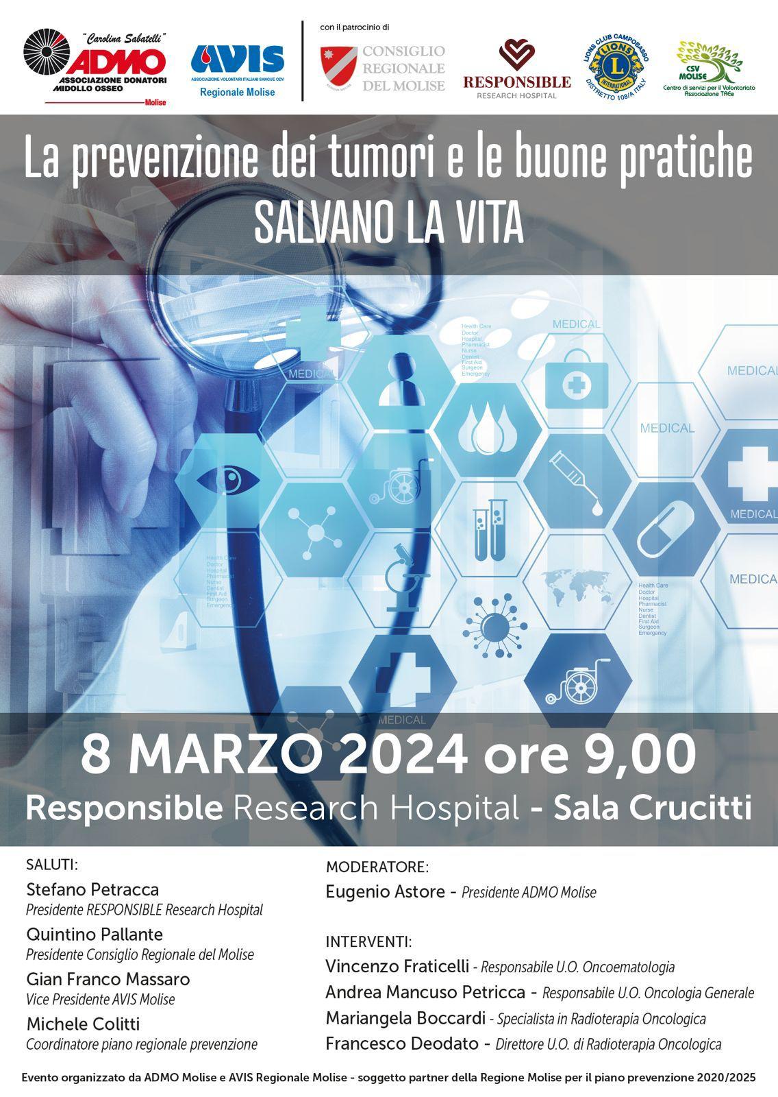 L’evento, patrocinato dal Consiglio Regionale Molise e dal Responsible Research Hospital, si terrà venerdì 8 marzo dalle ore 9.00 nell’Aula Crucitti del Responsible Research Hospital a Campobasso. La scelta della Festa della Donna non è casuale, ma è un segnale di particolare attenzione, soprattutto alla prevenzione delle patologie che riguardano l’ambito propriamente femminile. “Non possiamo né vogliamo dimenticare, anche in questa occasione, il supporto che la Presidenza del Responsible Research Hospital, ha dato e continua a dare al mondo del volontariato” commenta Eugenio Astore, Presidente Avis Campobasso – Admo Molise “per questo li ringraziamo per la fiducia che hanno voluto riporre in noi”.