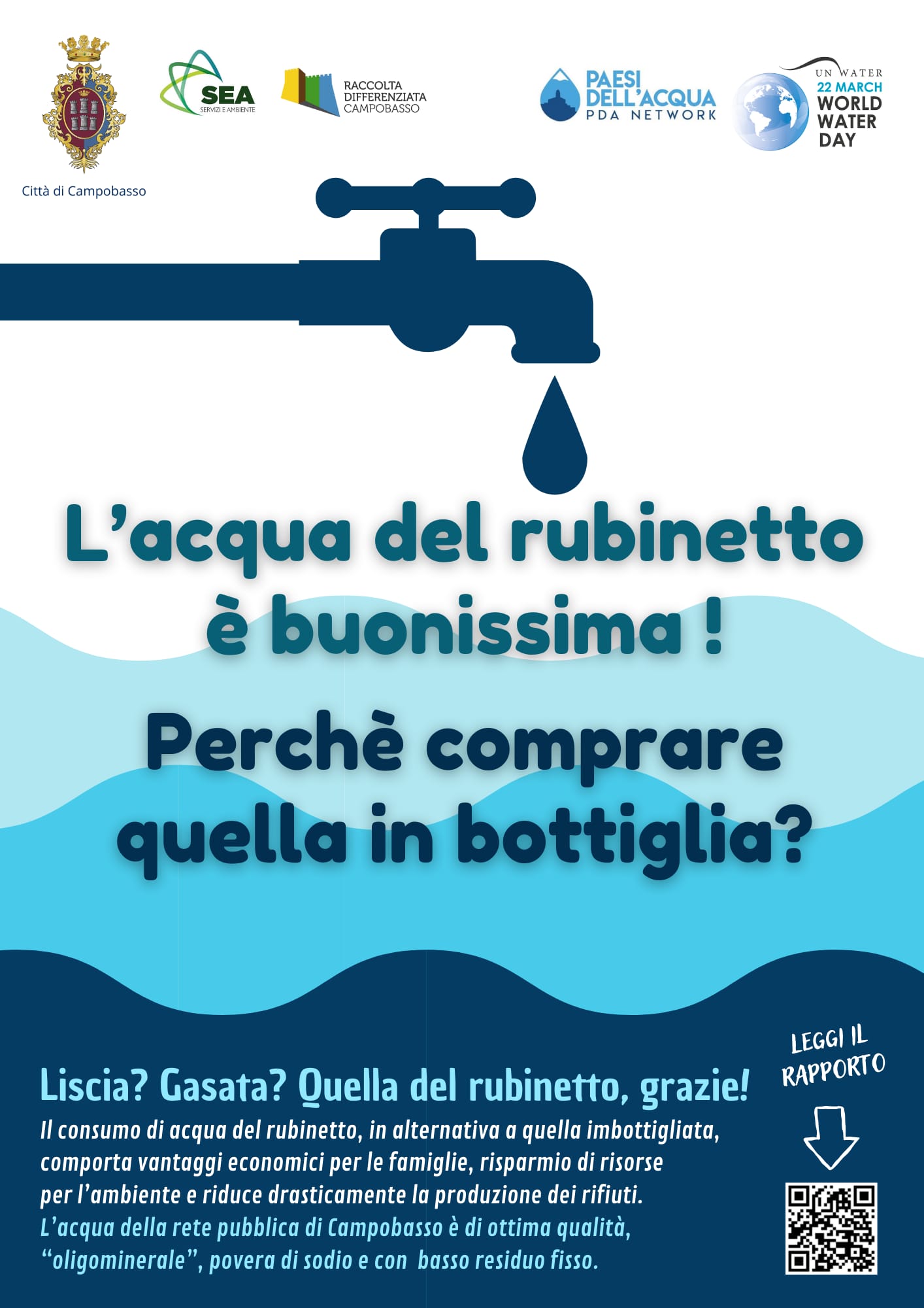 CAMPOBASSO – In occasione del 22 marzo, Giornata Mondiale dell’Acqua, il Comune di Campobasso promuove la qualità dell’acqua della rete pubblica che, anche quest’anno, si conferma di eccellente qualità, classificabile nella categoria “oligominerale”, povera di sodio e con un basso residuo fisso, certamente adatta all’uso quotidiano e con un’ottima azione diuretica.