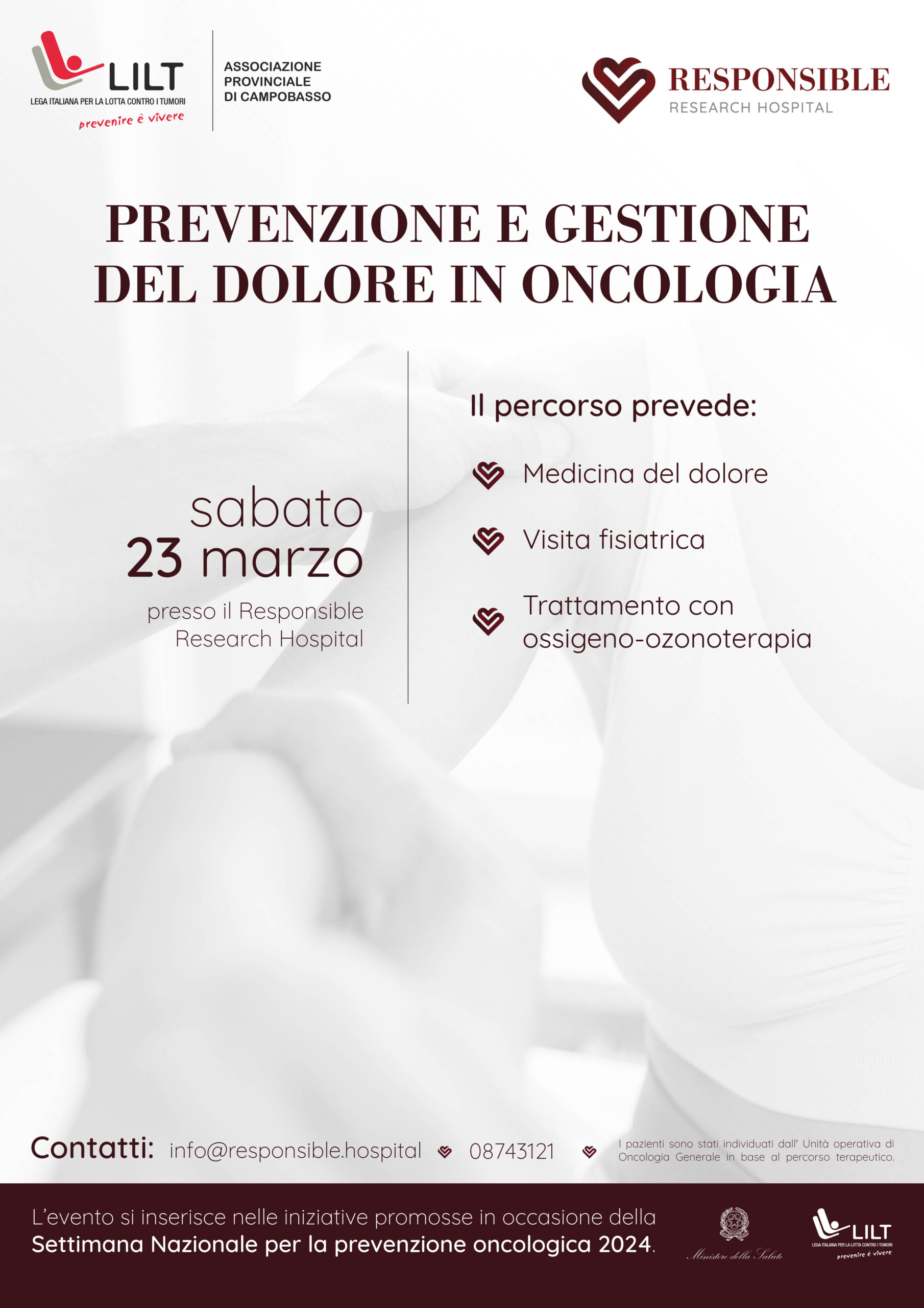 Nella mattinata di sabato 23 marzo, dalle 9.00 alle 13.00, presso il Responsible Research Hospital, a Campobasso, si terrà uno screening gratuito per il trattamento del dolore nei pazienti oncologici. I pazienti selezionati dall’Unità Operativa di Oncologia, avranno la possibilità di seguire un percorso, che prevede: visita di medicina del dolore, visita fisiatrica e trattamento con ossigeno-ozonoterapia.