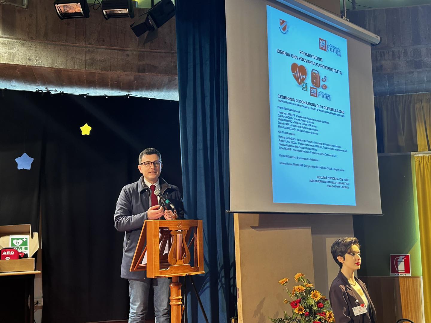 ISERNIA – Si è svolta questa mattina, mercoledì 27 marzo, presso l’Auditorium dell’Istituto ISIS Fermi Mattei, la cerimonia di consegna di 10 defibrillatori che la “Orizzonti Futuri Onlus” ha donato alla comunità locale, nell’ambito del progetto “Isernia una Provincia Cardioprotetta”, ideato e fortemente sostenuto dal consigliere regionale Roberto Di Baggio.