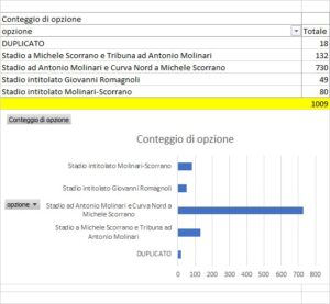 Su 1169 votanti sono stati 1009 i voti validi che hanno decretato – con una prevalenza netta – l’affermazione della prima proposta: lo stadio intitolato al presidente Antonio Molinari e l’intitolazione formale della Curva Nord al capitano Michele Scorrano. Le preferenze accordate a questa opzione sono state 730.