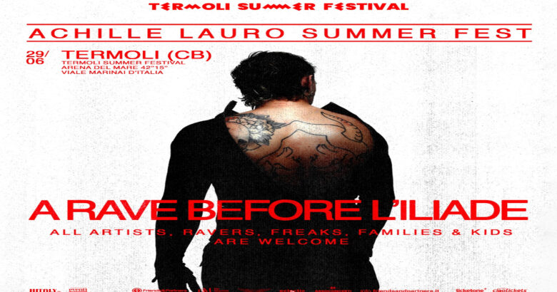 Il cantante annuncia oggi sei nuovi appuntamenti dal vivo dell’“Achille Lauro Summer Fest – A RAVE BEFORE L’ILIADE” la nuova e incandescente leg estiva con special guest Boss Doms, che partirà a fine maggio e proseguirà per tutta l’estate arrivando anche a Termoli (CB), Grado (GO), Sordevolo (BI), Iglesias (SU), Pagliare del Tronto (AP) e Trento.