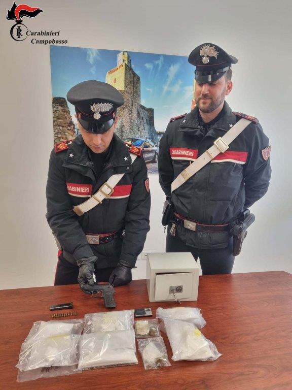 I militari del Nucleo Operativo e Radiomobile della Compagnia Carabinieri di Termoli comunicano che “a seguito di una perquisizione nell’appartamento dei due hanno rinvenuto, in una cassaforte all’interno del garage di pertinenza, una pistola semiautomatica calibro 6,35 con matricola abrasa perfettamente funzionante munita di un caricatore e di n.12 cartucce del medesimo calibro, 6 buste in plastica termosaldate contenenti complessivi 532 grammi di cocaina nonché 29 grammi di hashish, un bilancino di precisione e materiale per confezionamento di stupefacenti.