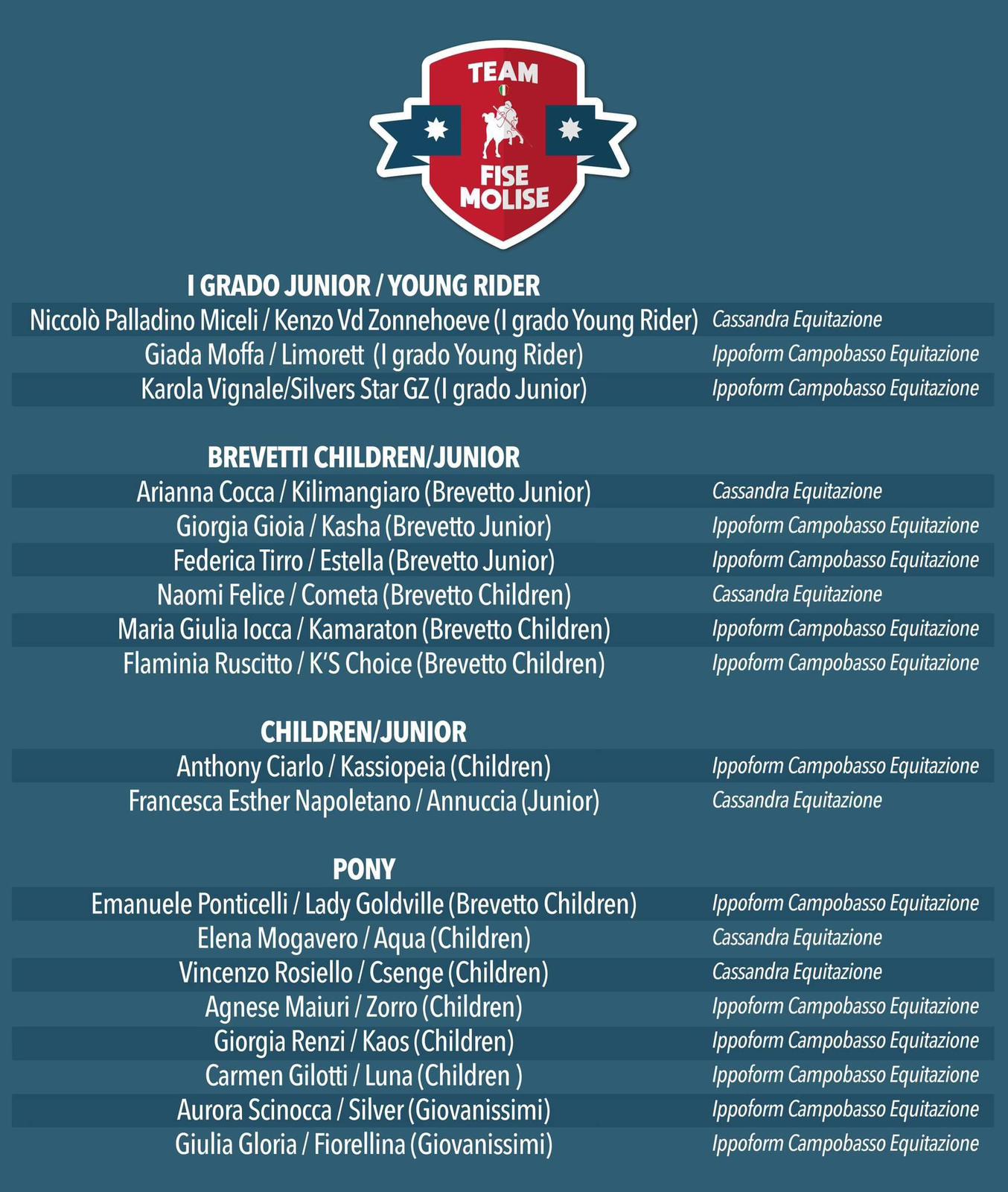Di seguito i giovani cavalieri appartenenti al Team Molise, alcuni dei quali candidati per l’anno 2024 alla partecipazione in importanti competizioni di interesse federale: