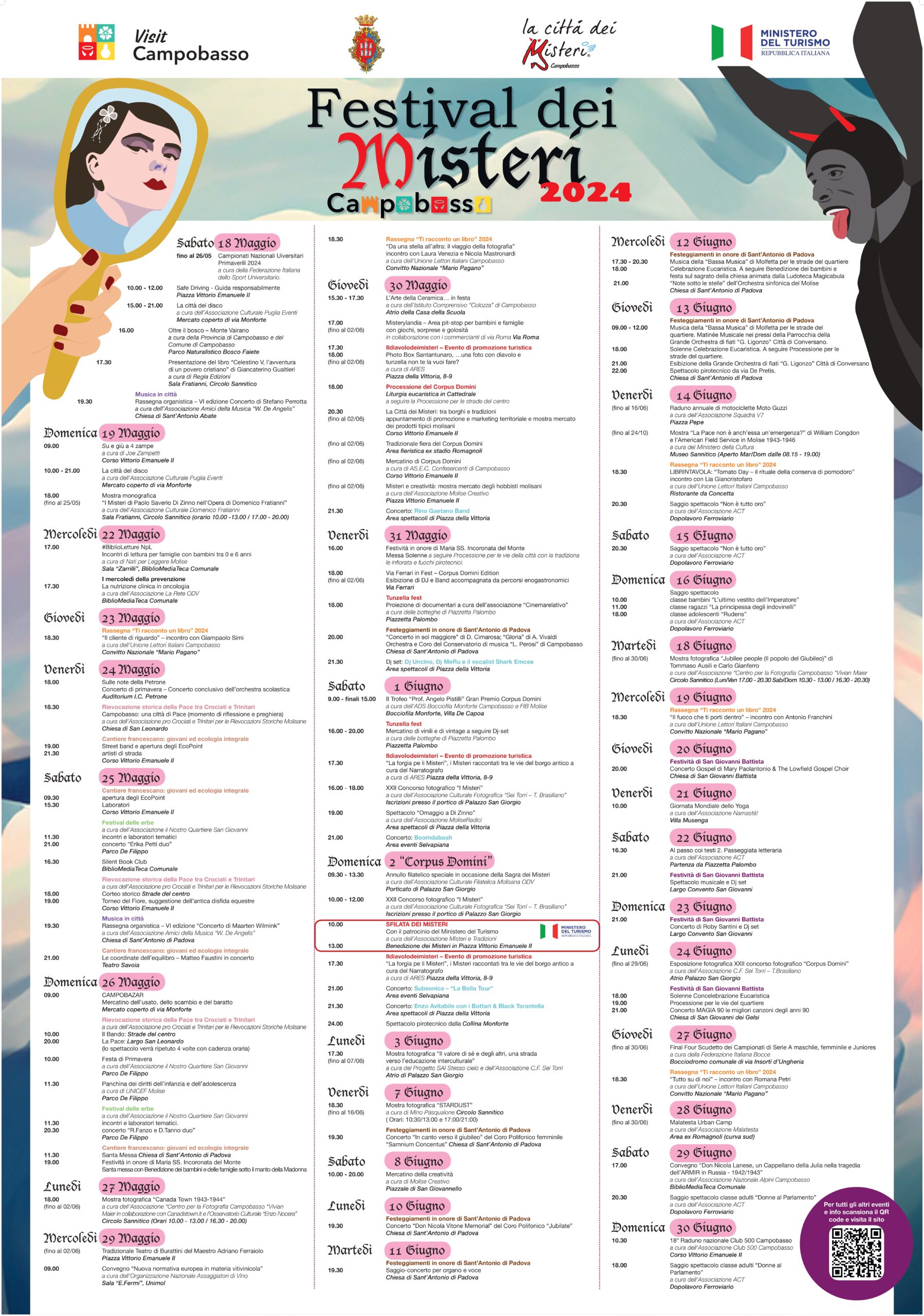 Per questa edizione, il Comune di Campobasso ha messo in piedi un cartellone ricchissimo che, di fatto, apre l’estate campobassana. Partono da oggi gli appuntamenti che accompagneranno i cittadini per oltre un mese fino a fine giugno: dalla musica allo sport, dalla lettura alla fotografia ce n’è per tutti i gusti e per tutte le età. Un mese ricco di tradizioni, riti religiosi ed arte per offrire ai tanti turisti un vissuto denso di storia e cultura.