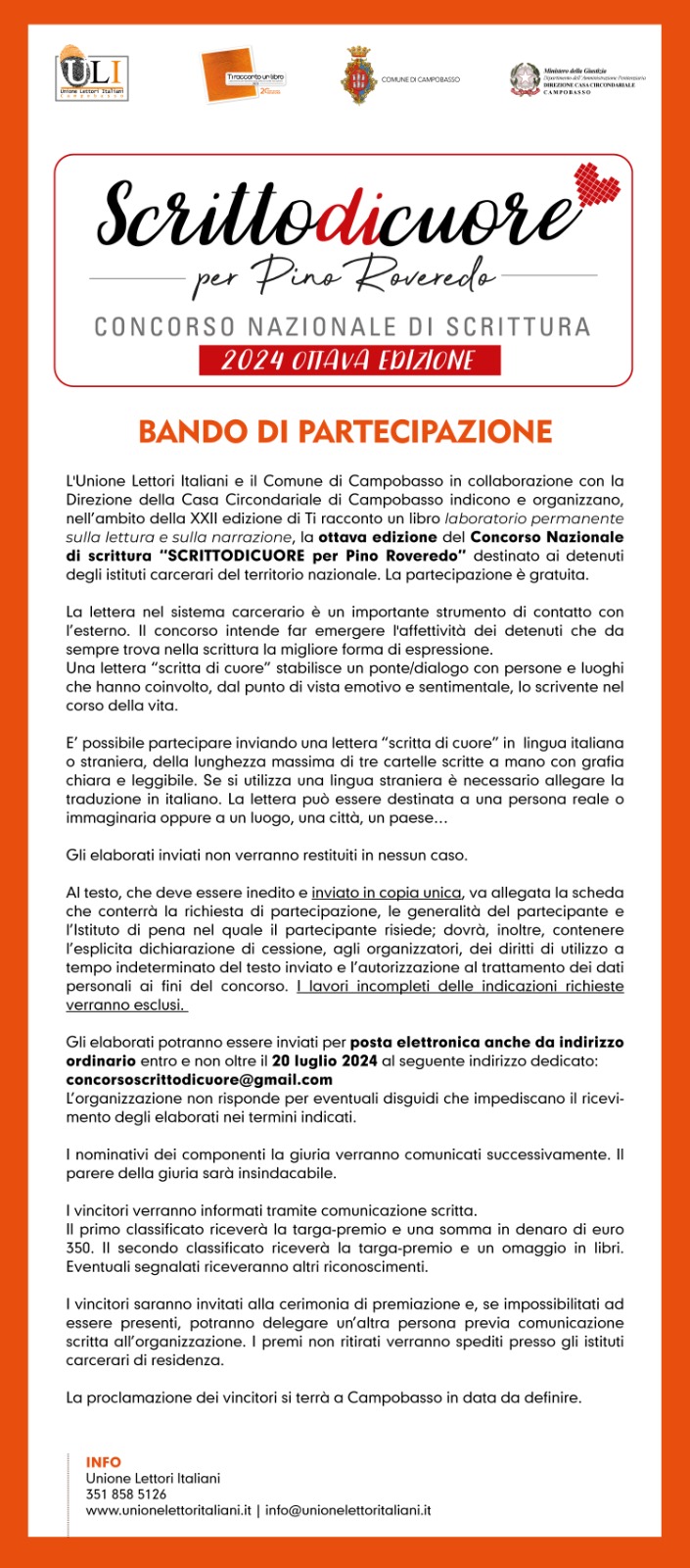 Il concorso, destinato ai detenuti degli Istituti carcerari di tutto il territorio nazionale, è realizzato con la direzione artistica di Brunella Santoli, la collaborazione della Direzione della Casa Circondariale di Campobasso e il patrocinio della Provincia di Campobasso nell’ambito di Ti racconto un libro laboratorio permanente sulla lettura e sulla narrazione 2024.